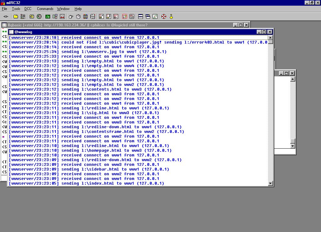 Sadly, Milo Sedlacek (aka Gradius) has died of leukemia. We have put up a collection of web pages to commemorate his life and what he lived for (which was mainly programming). Click here to go there. Click here for an MOV of Bill Gates getting the Blue Screen Of Death during a public demonstration of Windows 98. Here is an animated GIF which I just made: ![]() This homepage used to be hosted on my own WWW server called mIRC-WWW. The server is programmed entirely in mIRC code, supports binary files, and partially supports CGIs. A screenshot is available here. The script makes use of the advanced features of mIRC v5.8, which adds, starting with version 5.3, over the previous version with picture windows, custom sockets, previous version, picture windows, custom sockets, millisecond timers, and much more. You can check for news about mIRC by going to the mIRC Homepage. You can download another script I made, which makes use of all the above mentioned features, called Easel, by clicking here. And please, PLEASE, if you find a link on this page which does not work, please email me to let me know. If there is anything in particular that you'd like to see on this page, just tell me about it, and I might just put up a link to it. You can almost always find me on IRC, usually in #qbasic, with the nick logiclrd or logiclr-. Anyhow, enough with the mindless chatter. Please enjoy my homepage, and have a good christmas! |